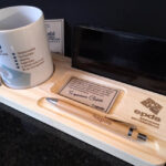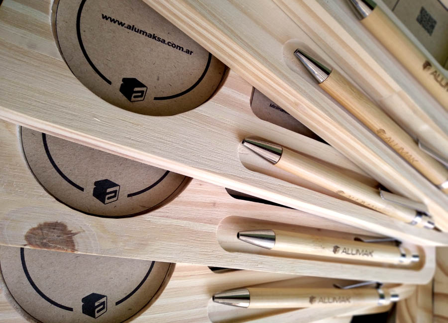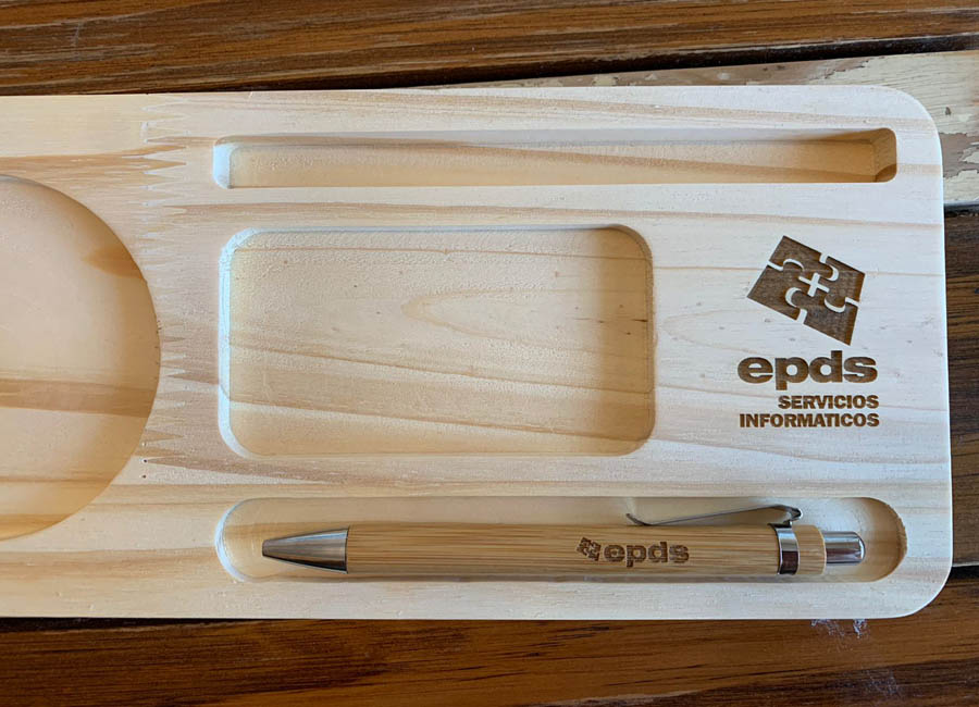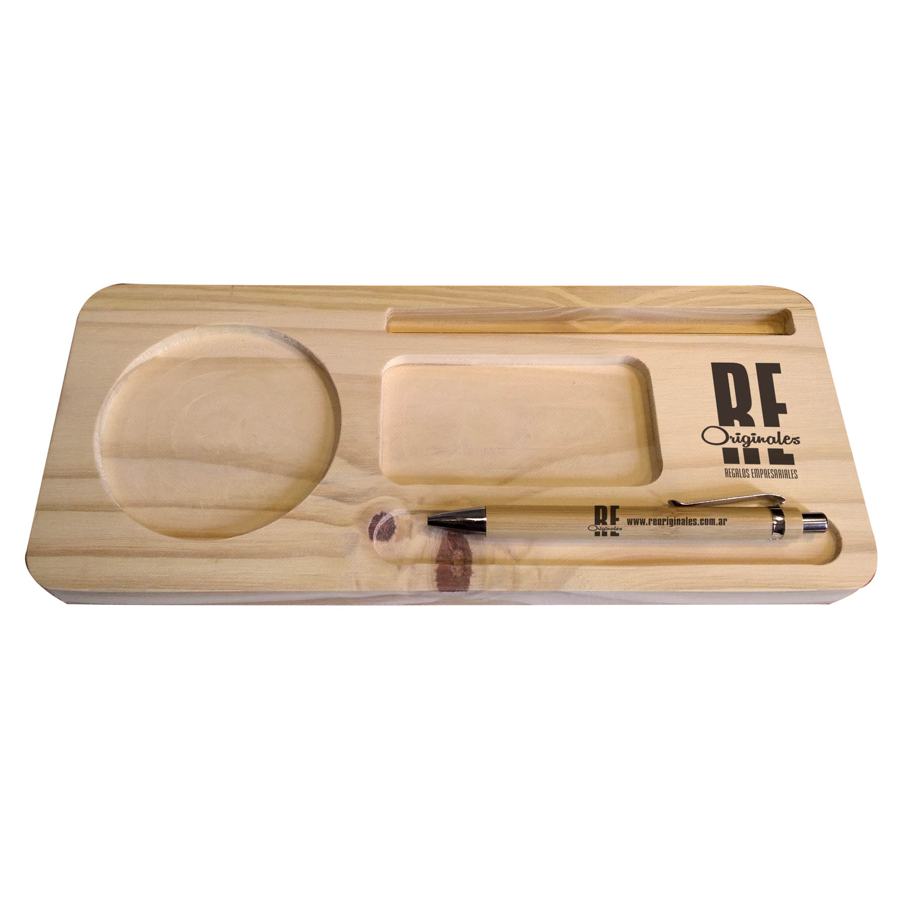 Con espacio para taza/mate, tarjetero, apoyo de celular o anotador y lapicera/lapiz, realizado en aglomerado de pino. Con grabado de logo/s.